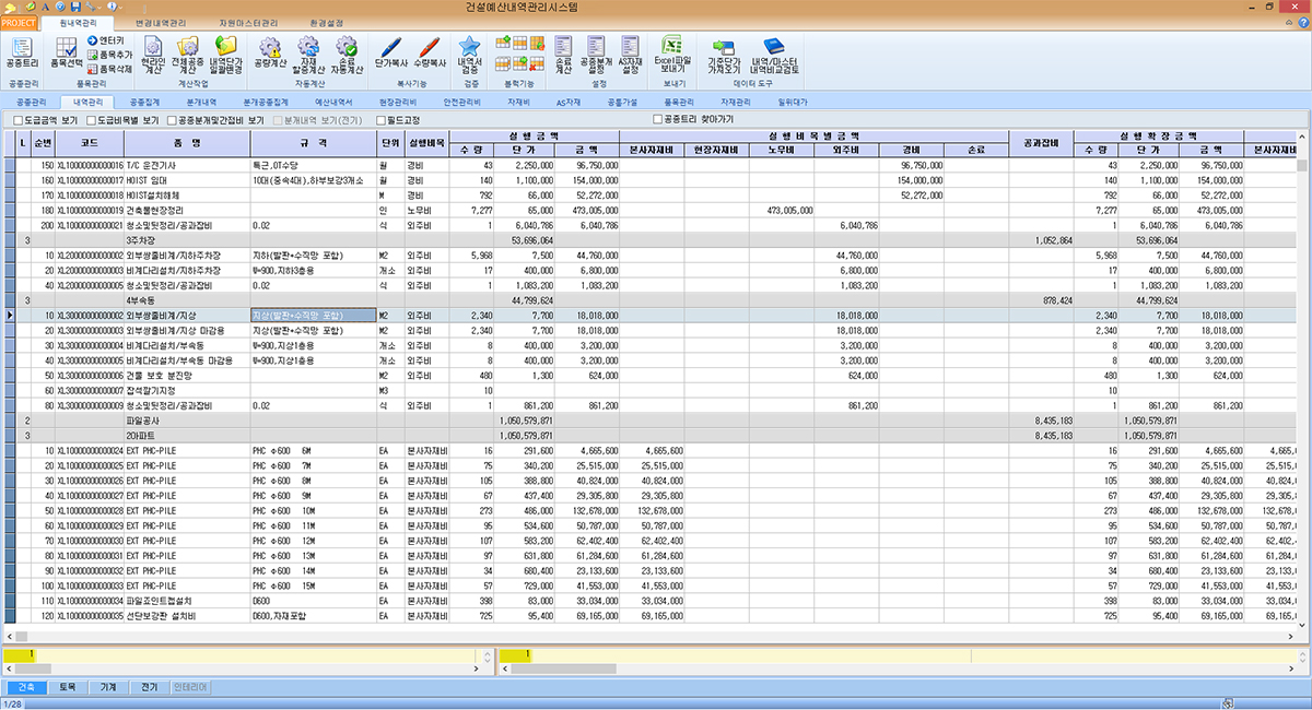 - 내역을 발주공종 분류별 조회 내역작업 가능