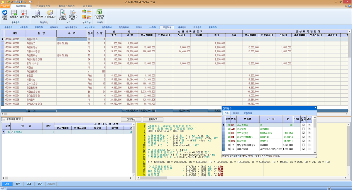 -전역변수를 이용하여 공통가설 항목별 산식을 입력하여 공통가설비 산출 가능
