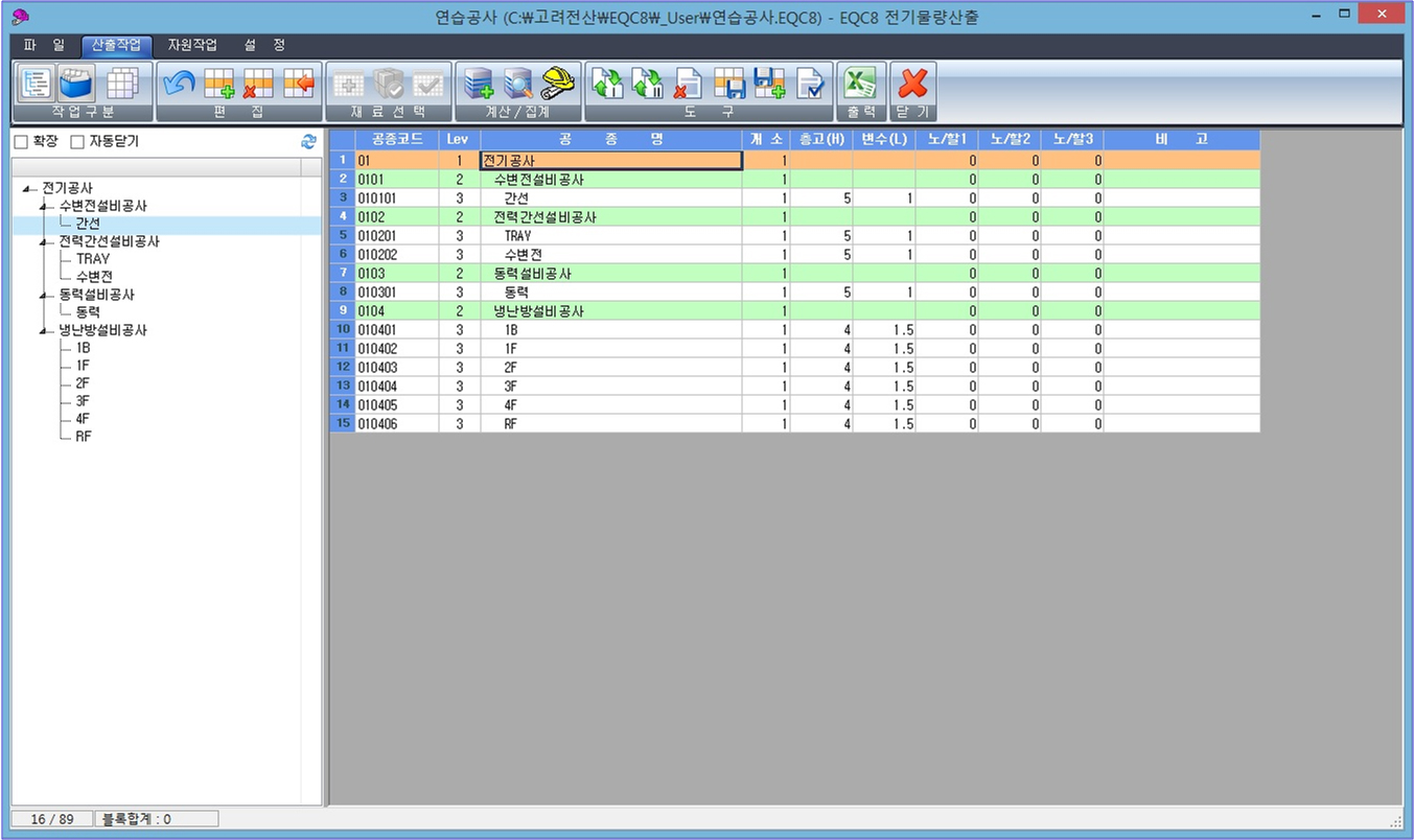 EQC(Electrical Quantity Calculation) 전기 물량산출 프로그램은 전기공사에 사용되는 모든 자재 및 인건비 품목을