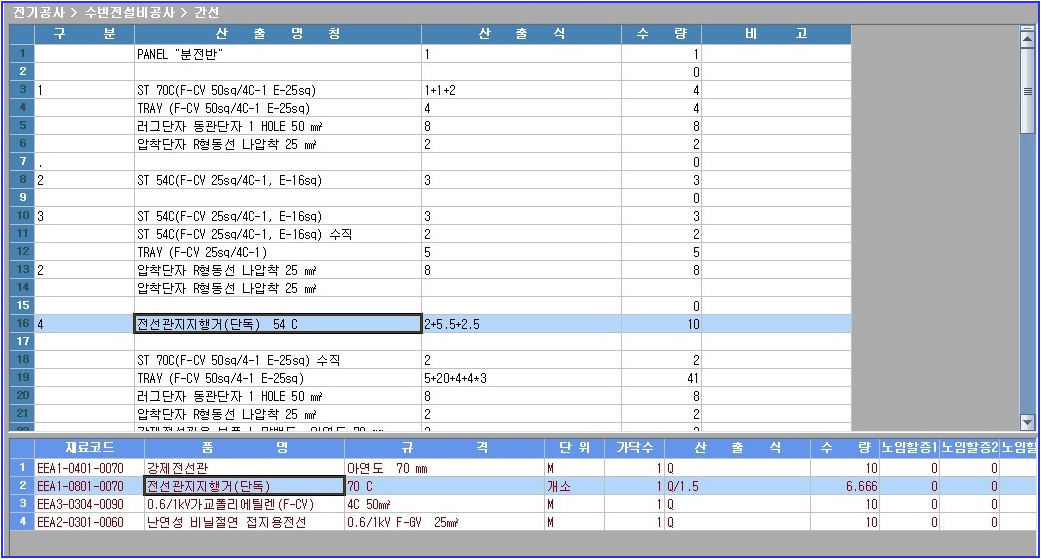 기본자료로 구축하고 도면별, 회로별로 필요한 항목들에 대한 물량을 산출 하면 재료의 할증 및 공량을 자동 계산하여